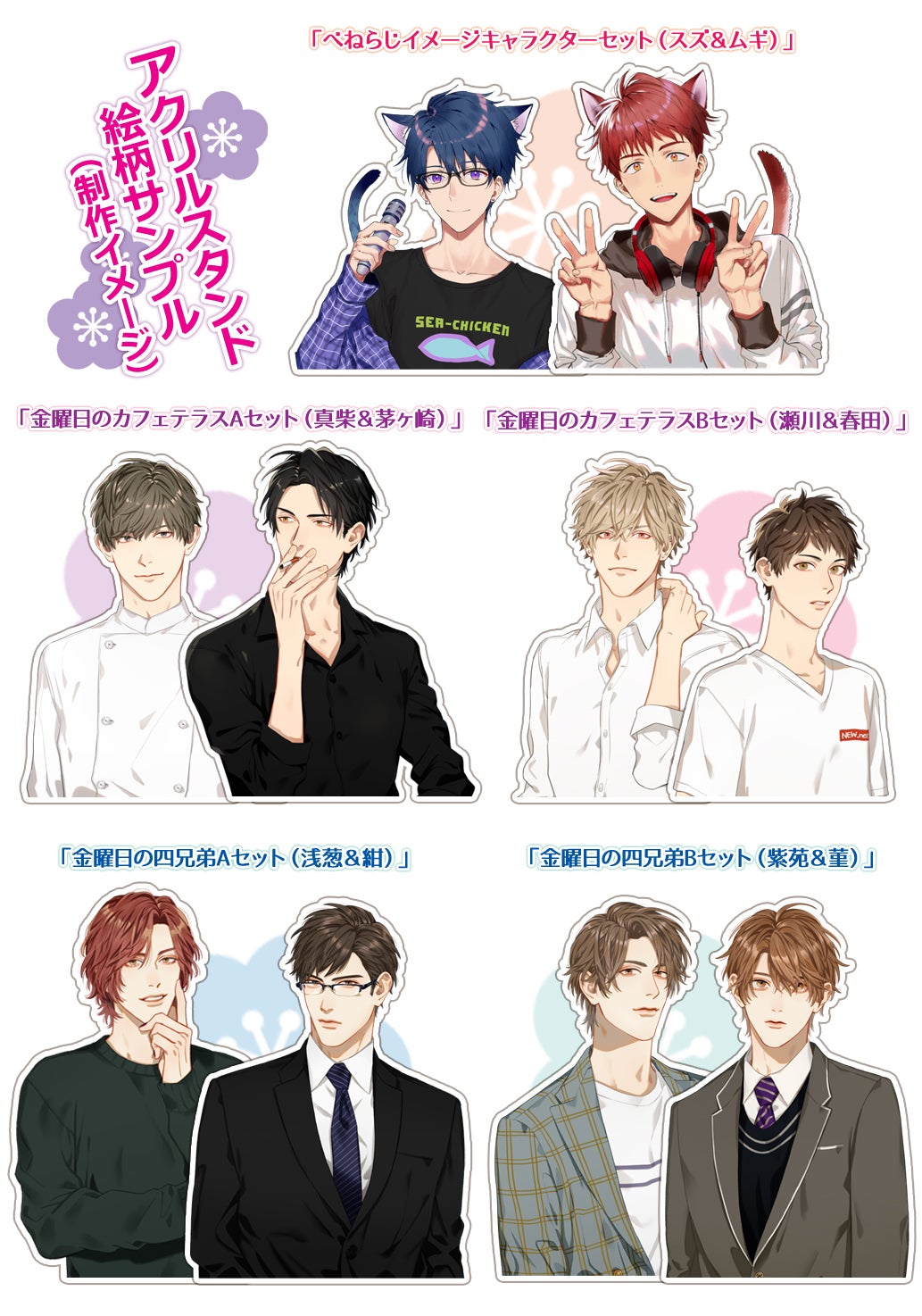 絵柄は「べねらじイメージキャラクターセット(スズ&ムギ)」「金曜日のカフェテラスAセット(真柴&茅ヶ崎)」「金曜日のカフェテラスBセット(瀬川&春田)」「金曜日の四兄弟Aセット(浅葱&紺)」「金曜日の四兄弟Bセット(紫苑&菫)」よりお選びいただけます。