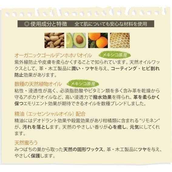 クリーナー、ワックス(ツヤ出し)、乳化性同等の保革、防滴、カビ防止効果を一つに集約し、注目の分野である、香り(エッセンシャルオイル)による身心へのアロマ効果(リラックス、ストレス解消など)も期待できるケアクリームです。