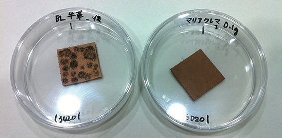 *5種類のJIS規格試験カビ菌を培養後、革片に噴霧し温度26±2℃、湿度95%に保たれた環境下で28日間試験を行った物です。未処理品は、7日目で菌糸の発育部分面積が全面積の1/3を超えたのに対しマリアクレマ塗布品は、28日目でも菌糸の発育部分面積が全面積の1/3を超えませんでした。
