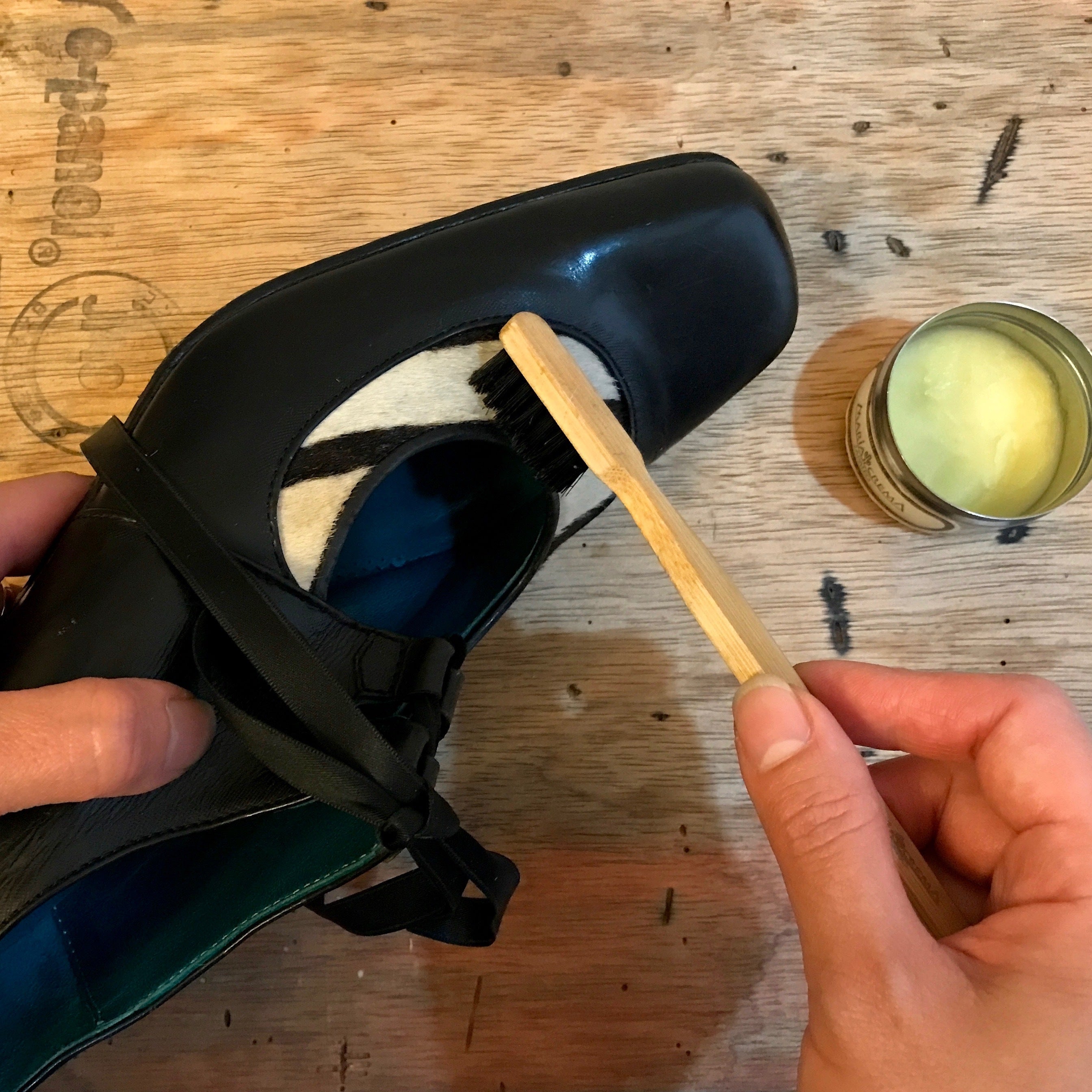 ハラコ、スエードなどの起毛素材には、ブラシの毛先にちょんちょんとMARIACREMAをつけて、ブラッシングするようにお使いください。