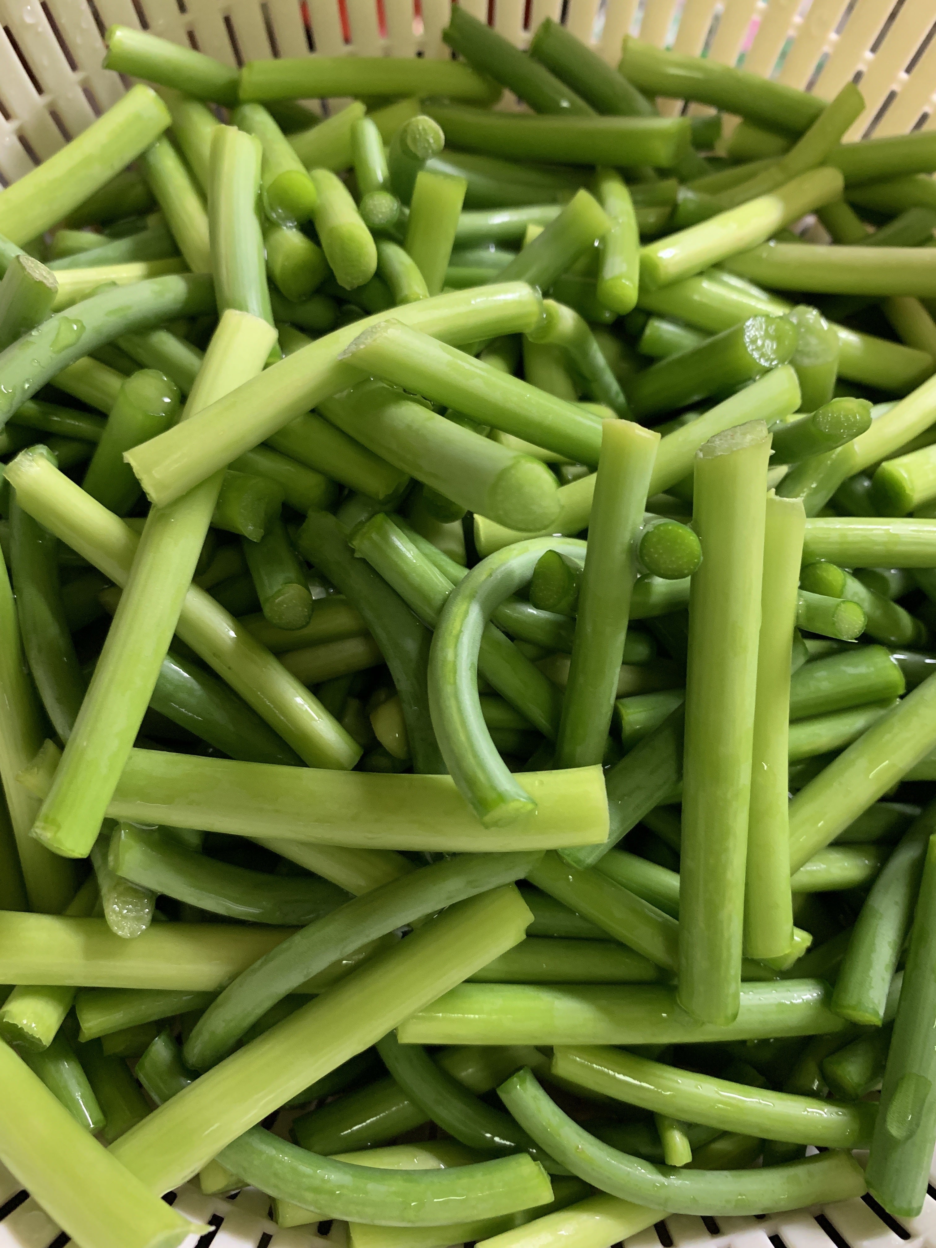 雨が降ったので夕方の農園行きはおやすみして、行く度に採っては冷蔵庫に入れていたニンニクのとうを写真のようにカットして冷凍に。以前は葉っぱも食べていましたが、初老には噛みきれないのでサヨナラしています。