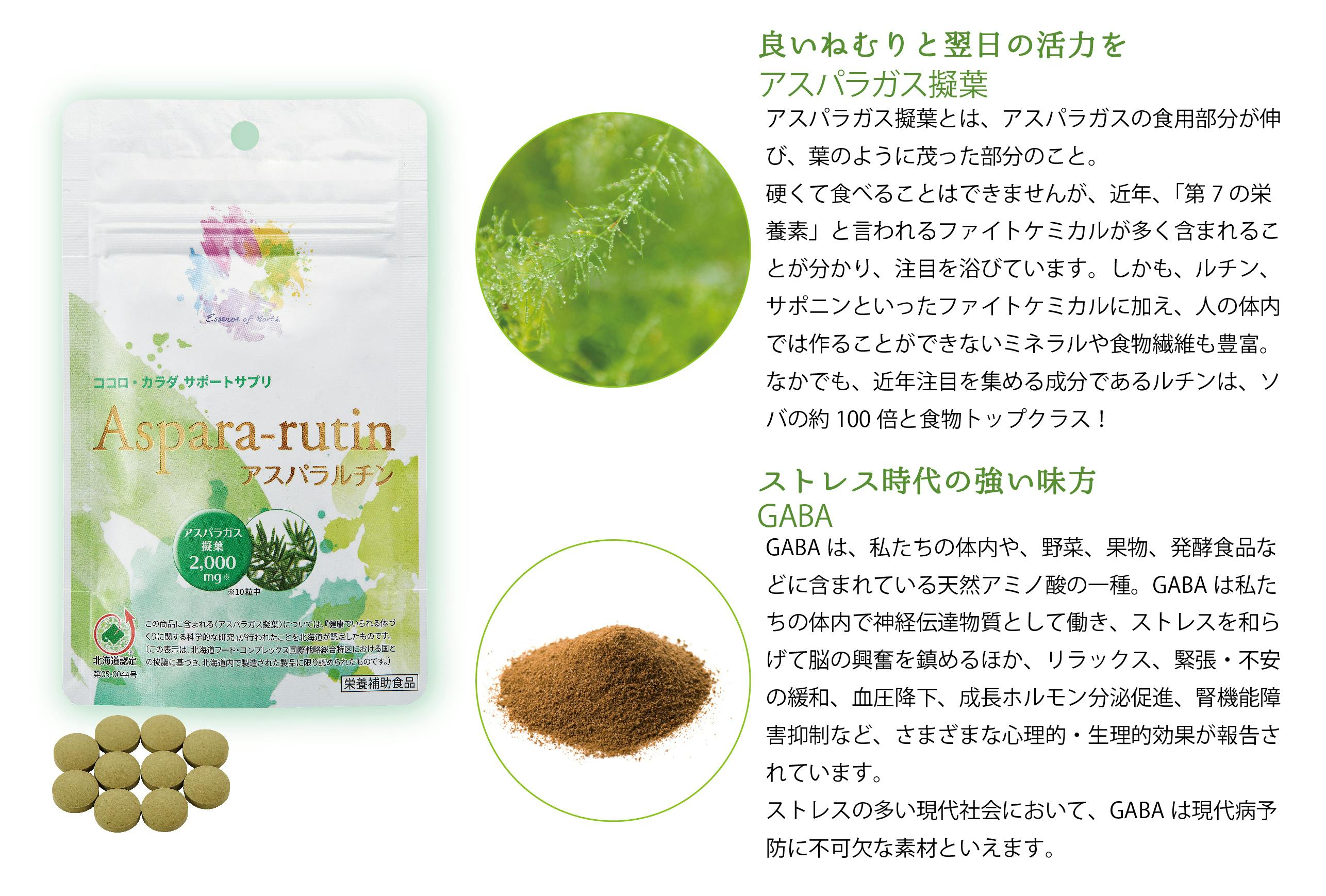 アスパラルチンは、ルチン、サポニン、ミネラルを豊富に含んだ北海道産アスパラガス擬葉を使用。さらにGABAをプラスし錠剤にしたサプリメントです。