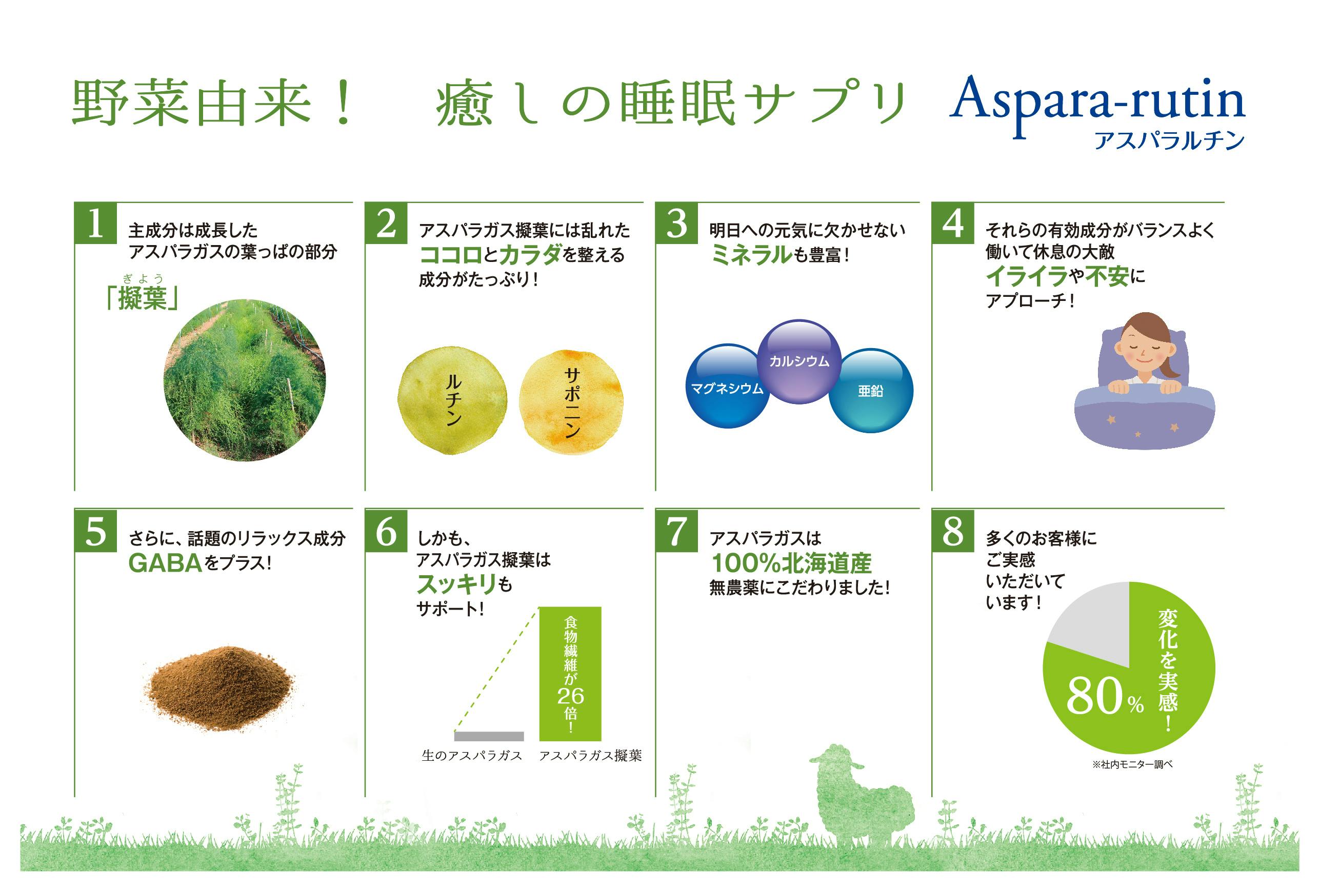 今回、弊社の健康事業部門であるレッドホースウェルネスから、睡眠サポートサプリ「アスパラルチン」をご紹介します。「アスパラルチン」は、アスパラガス擬葉に、ルチン、サポニン、GABAなどをプラスした睡眠サポートサプリです。