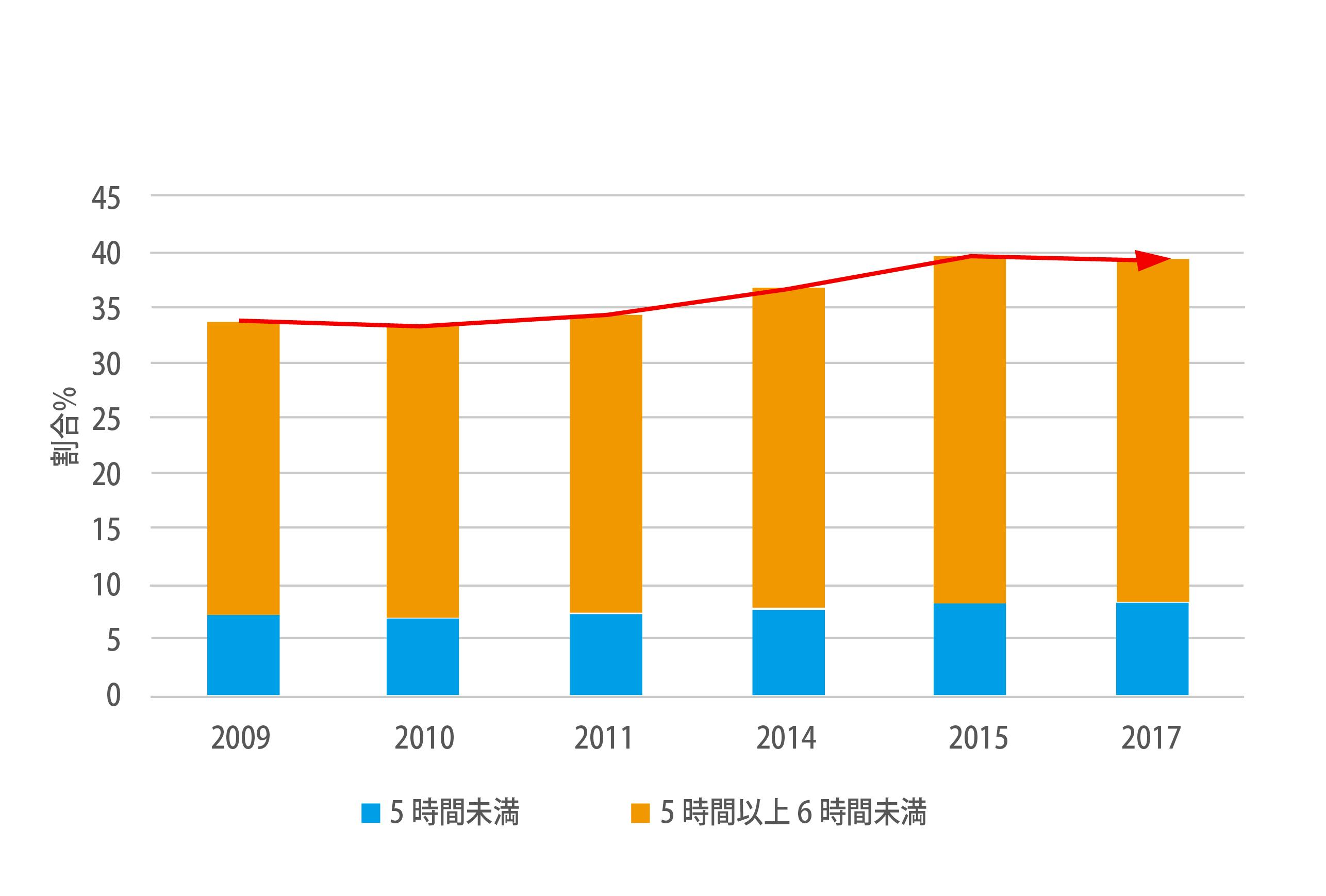 突然ですが、日本人で1日の睡眠時間が6時間以下の人が約4割にも上ることをご存知でしょうか。(下記図参照)