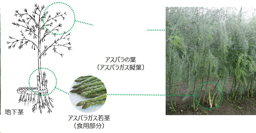 アスパラガスの若茎(食用部分)が伸び、葉のように茂った部分のこと。硬くて食べることはできませんが、近年、「第7の栄養素」と言われるファイトケミカルが多く含まれることが分かり、注目を浴びています。