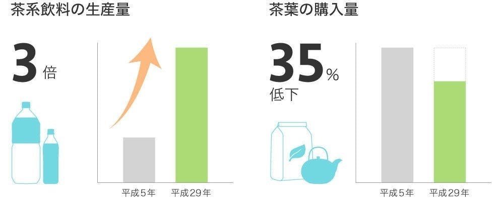 緑茶やほうじ茶などお茶関連のペットボトル飲料が増え、黒烏龍茶のブームなども起こり、茶系飲料全体の生産量は平成5年から29年で約3倍まで拡大しています。一方、急須を持たない世帯が増え、茶葉から入れるお茶の購入量は、平成5年から29年で約35%も低下しています。