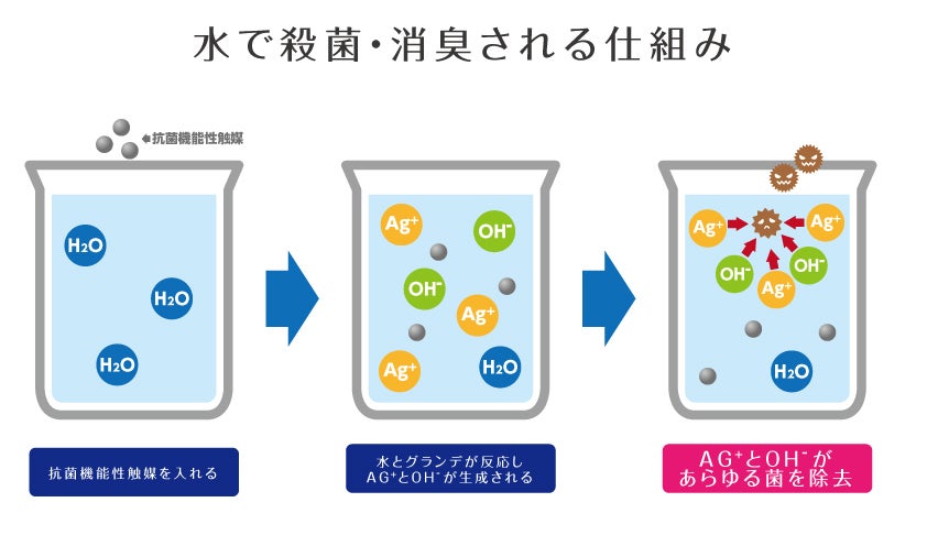 水に抗菌機能性触媒を入れることによって、〝銀イオン〟と〝マイナスイオン〟という物質が生成されます。この2つの物質が、高い除菌作用持ち、臭気を分解してくれるのです。