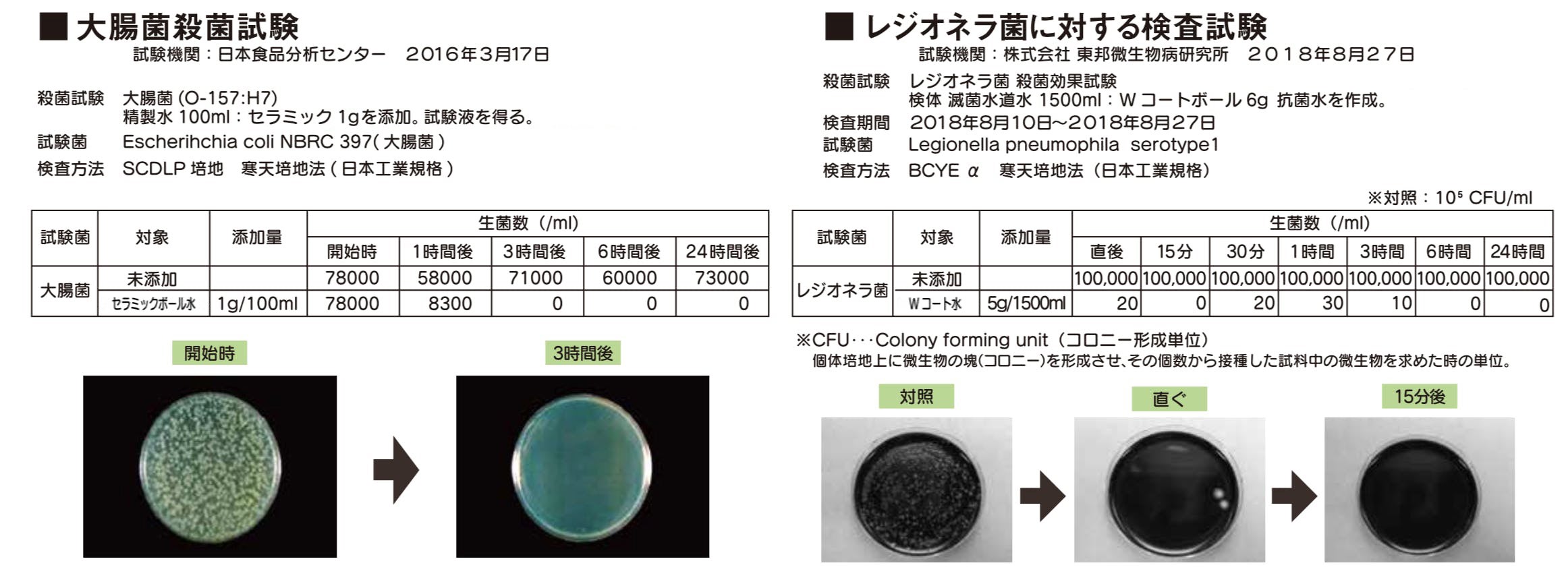 ・レジオネラ菌:15分後には菌が消滅しています。