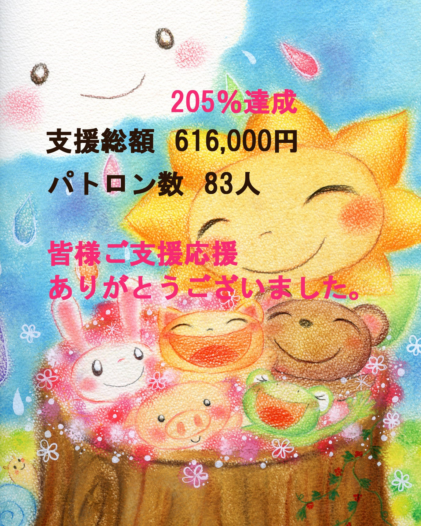 • 皆様のおかげで無事に終了することが出来ました。絵本を広げたい、皆様ともっと深く繋がりたいと始めた初めてのクラウドファンディングは、沢山の方の優しさや愛を感じることが出来ました。お蔭様で205%83名の方にご支援頂きました。ありがとうございます。発送準備はほぼほぼ出来てるので、明日には届くところも多いと思います。ご支援、応援本当に本当にありがとうございました。 もっと見る
