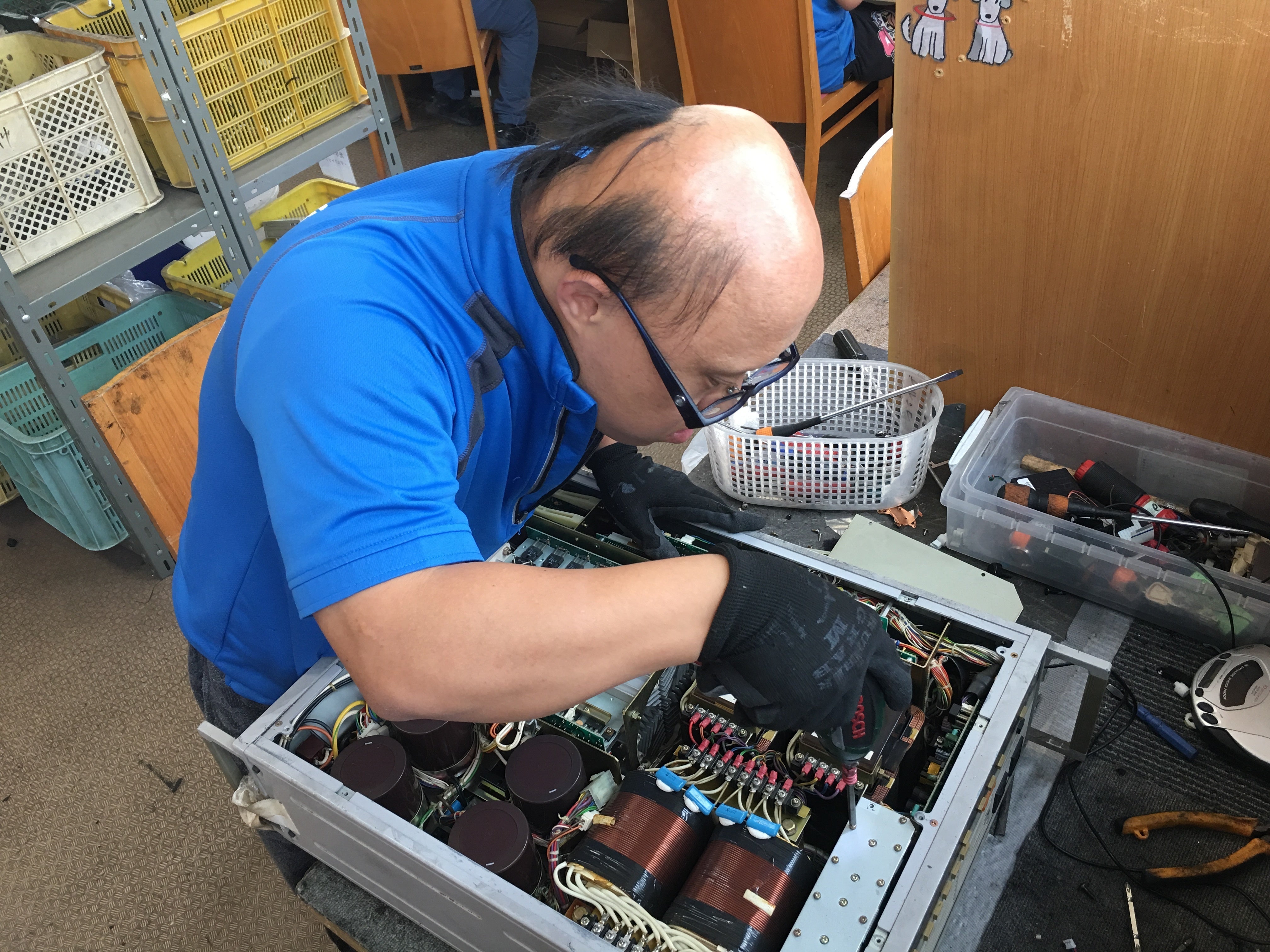 ここでは都市に埋もれる使用済み小型家電を鉱山と見立てた「都市鉱山」から障害を持つ仲間達が手作業で丁寧に解体、分別をする「都市鉱山発掘隊」がいます!