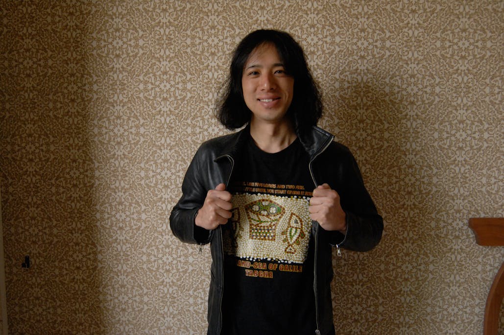 ・撮影で使用したレザージャケット(EMPORIO ARMANI・サイズM)、5つのパンと2匹の魚Tシャツ