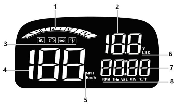 1. OBDモード時:RPM(エンジン回転数)、GPSモード時:衛星数