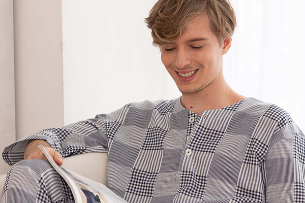 メンズ限定は丸首に開いたヘンリーネックの7分袖と長パンツのパジャマ。