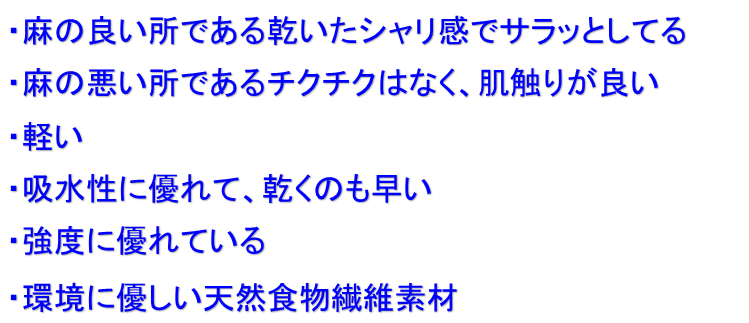 非常に軽く、麻のような乾いた手触りです。肌当たり快適な着心地を堪能できる素材です。 麻のような乾いたシャリシャリ感があって清涼感いっぱいなのに麻のようなチクチク感はない!!