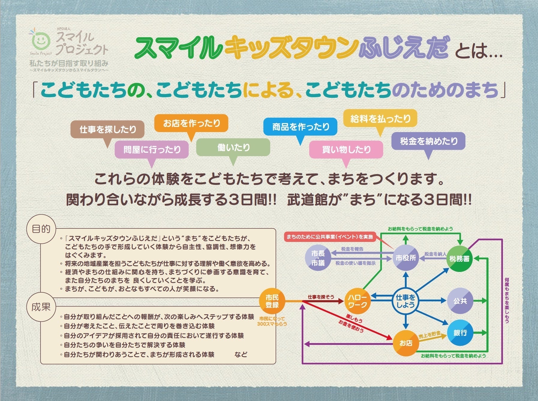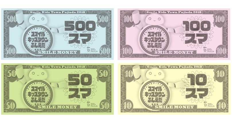 スマイルキッズタウンは職業体験ではありません。スマイルキッズタウンだけの通貨「スマ」を流通させてまちを運営します。こどもたちが創造したお店(飲食・物販・サービス)と、公共(市役所、銀行、税務署、放送局など)で働き、スマを稼ぎます。そして買物やゲームで遊んだりして、スマを使います。税金も納めます。スマが少なくなればハローワークへ行き、仕事を探し、働いてスマを稼ぎます。そしてスマを使う.....