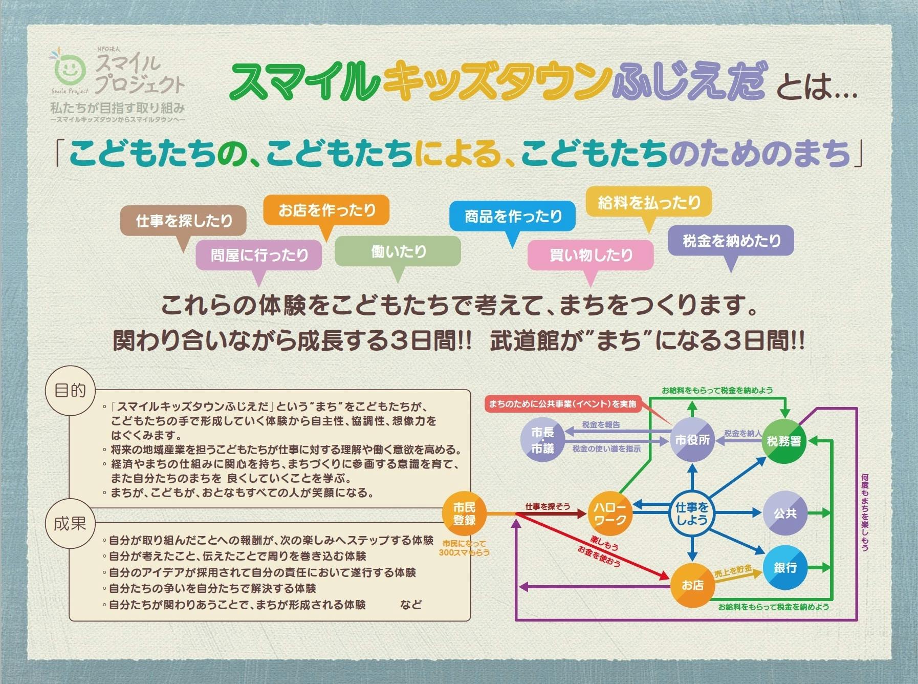 「スマイルキッズタウン」には様々な想いや目的がありますが、こどもたちが持っている可能性を感じながら、こどもたち、保護者様、行政、地元企業、他団体、ボランティアはじめ地域の皆様と一緒に笑顔あふれる“こどものまち”を創造していきます。