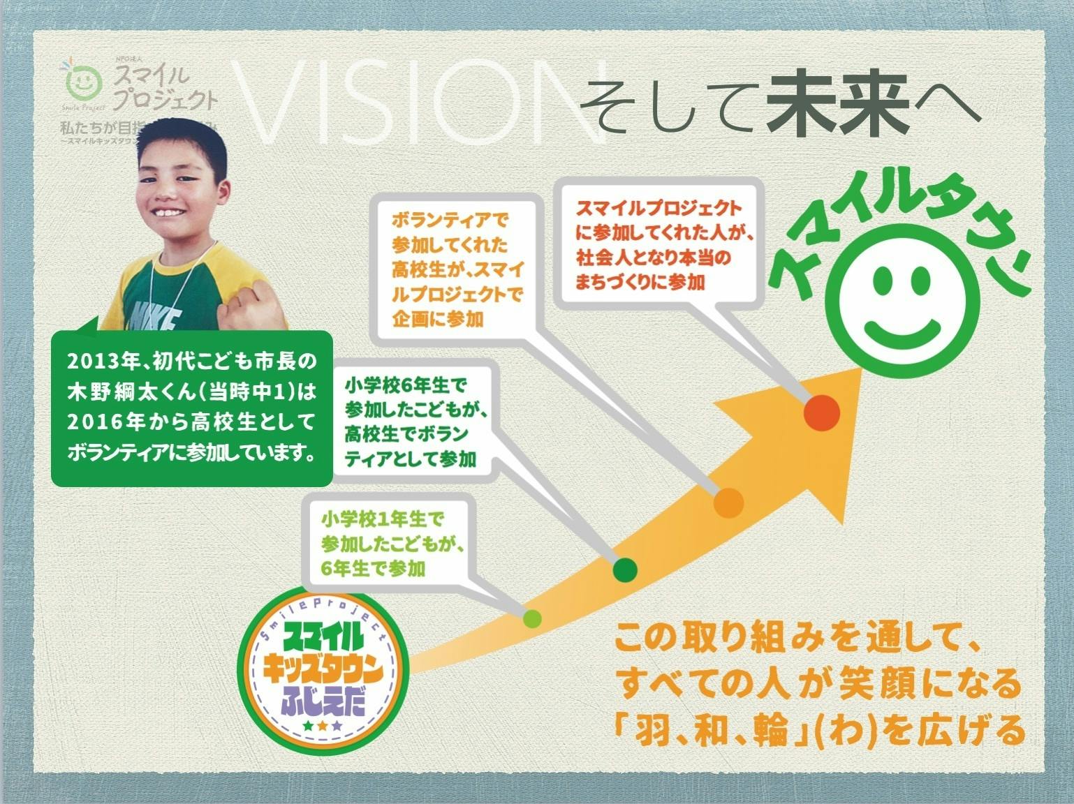 7年続けることで、こどもたちの成長する姿を見ることができ嬉しく思います。この6年間の内に参加したこどもたちの何人かはボランティアスタッフとしてお手伝いをしてくれています。また、今参加しているこどもたちからは、「高校生になったら、ボランティアスタッフでお手伝いするよ」と言ってくれるお友達も増え、私たちの「VISION」でもあります「スマイルキッズタウン」から「スマイルタウン」への着実な歩みを実感することができました。これからも毎年楽しみながら成長する「スマイルキッズタウン」を多くのこどもたちに体験してもらえたら幸いです。