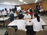 その後、参加者をランダムに6つのグループに分け、こども達が行う店づくりの一部(スマイルノートの作成)を体験しました。お店作りのために必要な仕入れ、製品作り、給料計算などを大人スタッフの説明を交え進めていきました。初めて同士でしたが、次第に打ち解けて楽しく理解ができました。今年も元気な頼れるお兄さん・お姉さんとして活躍が期待されます。