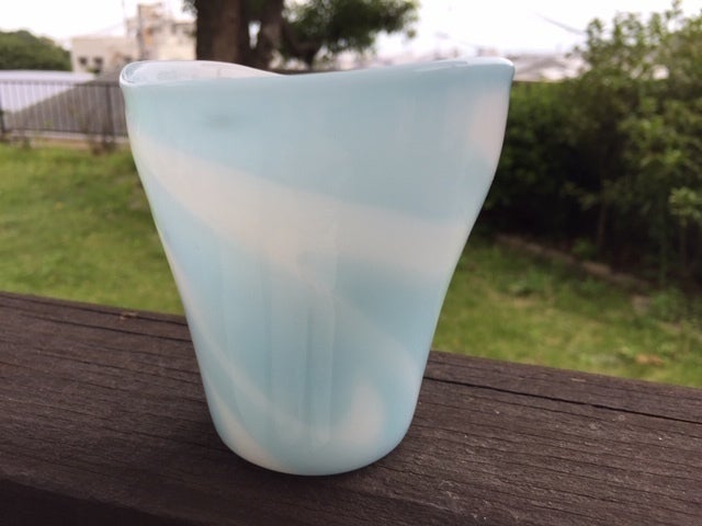 美しいマーブルカラーのミルクガラス次に是非とも商品化を進めたいのが自然で美しいジェードの濃淡のマーブルカラーのマグやタンブラー。水の流れや青空に白い雲が浮かぶようなイメージの美しいマーブルカラーのミルクガラス。もちろん一つ一つが違った表情に仕上がります。ほとんど偶然の賜物です。白とスカイブルーのマーブルカラー。乳白色のベースにジェードやブルー ピンクを練りこんでいくミルクガラスの本来の自然で美しい色合いです。生産は手間がかかり難しくリスクの高い作業になりますが是非とも次に商品化を進めたいと思います。オールドミルクガラス