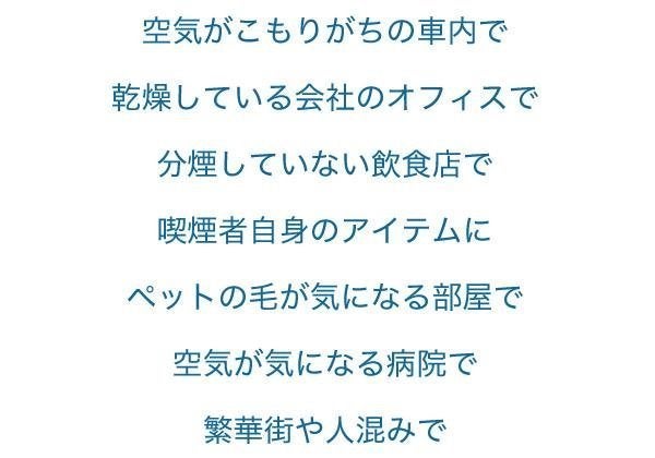 市場には似たような製品がたくさんありますが、これはシンプルでポータブル、そしてパワフルなデバイスです。日本に合うシンプルなデザインにしました。大気汚染は年々増加し、現在では家庭、学校、事務所に、空気清浄機があります。しかし、私たちはどこでも新鮮な空気が吸える新しい方法が必要です。この商品は仕事、学校、車や電車で移動するとき、軽量で小さく、使いやすい、機能が備わっています。