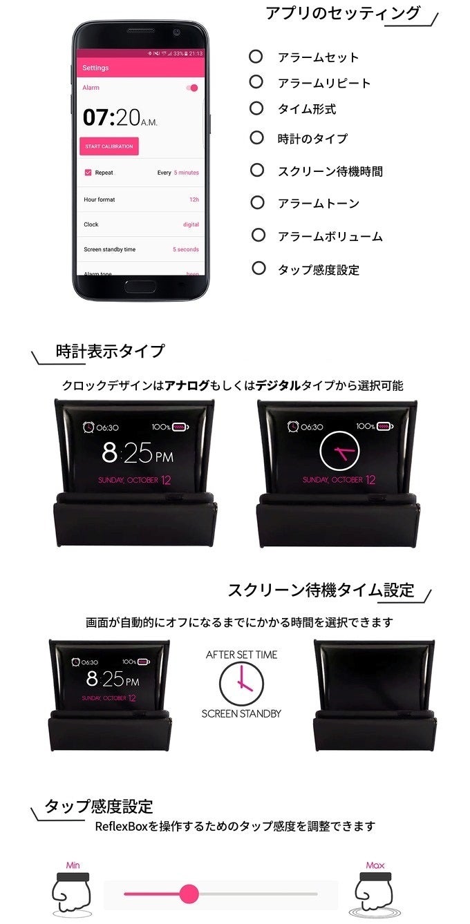 軽いタップでREFLEBOXのホログラムスクリーンに時間と日時が表示されます。夜間にスマホを操作する必要もなく、目にも優しい表示です。