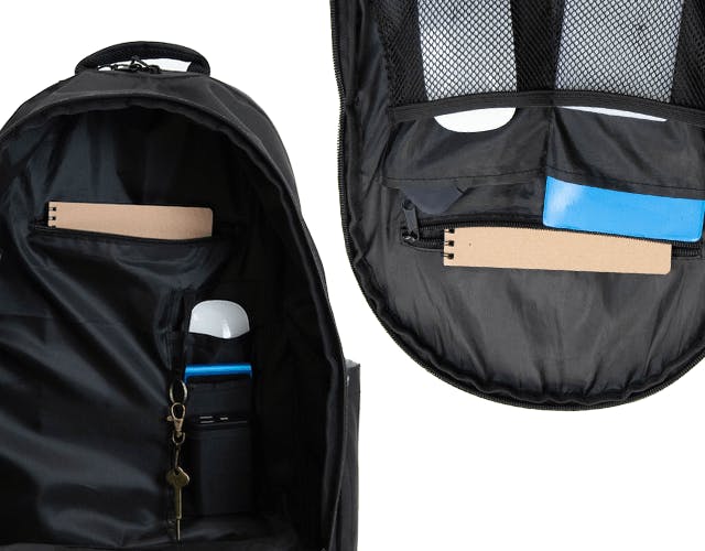メインポケット以外に、PC専用ポケットとマウスや充電器を入れるポケットを用意。安全に保護するため、PCポケットには緩衝材を使用。PCとタブレットを同時に持ち運べるよう、PCポケットには仕切りを設けている。