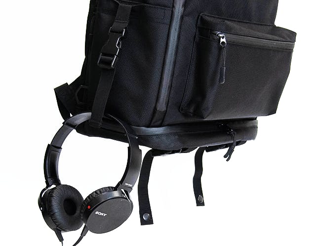 持ち運びに困るヘッドフォンをスマートに収納。アタッチメントでしっかりホールドでき、音楽を聴く時はワンタッチで取り外し可能。コードガイドもあるので、絡まず持ち運ぶことができる。