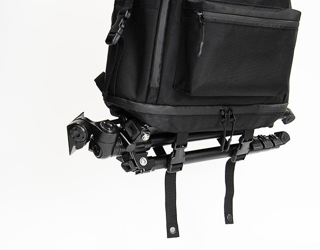 底面に重量のある三脚等を2段ストラップで固定できる。手に持って移動するのが少し面倒な三脚やスケートボード。底面にある2本のストラップでワンタッチで固定すれば楽に持ち運べる。