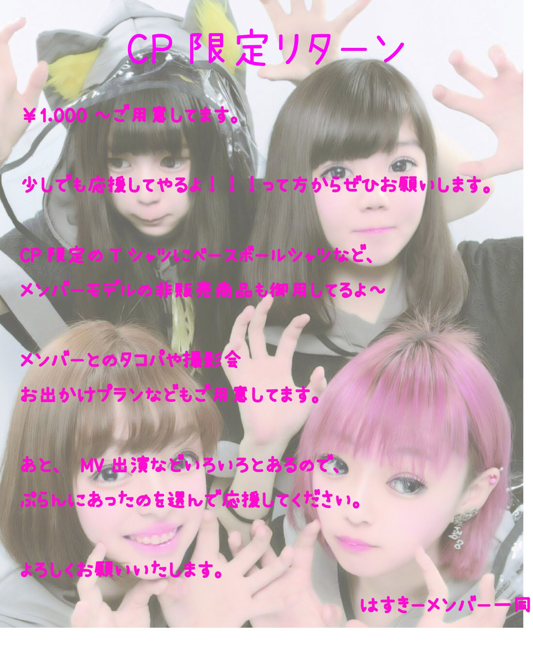 2019/06/08 21:12ストレッチゴールの設定お世話になります。husky《ハスキー》運営です。この度は、husky《ハスキー》のMV製作プロジェクトの達成ありがとうこざいました。残りの日程の間さらなるストレッチゴールを設けてよりhusky《ハスキー》の活動の幅を広げて行く事と質の高いMV製作が出来る様にご協力お願い致します。今回、ストレッチゴールとして達成率200%をゴールとしてメンバーの新衣装の作製を検討しております。2代目衣装を2年目を迎える辺り製作してメンバーの意識とパフォーマンスの向上に繋げて行きたいと思います。画像は新衣装のイメージ図です。メンバーそれぞれデザインが違います。ご協力お願い致します。 もっと見る
