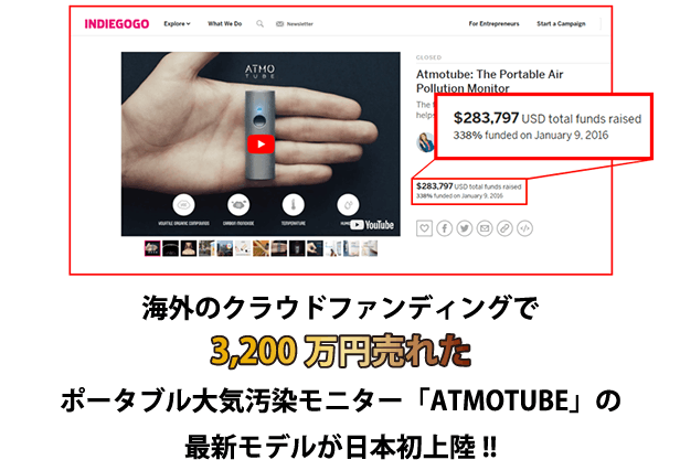 NotAnotherOneは今回、Atmotubeのために、5万2000米ドルの資金調達を目指すIndiegogoキャンペーンをローンチし目標額の338%、3千2百万円以上を集めて、ついにAtmotube Proを皆様にお届けする用意が整いました。