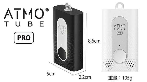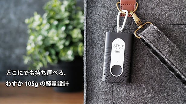 A. AtmotubePROは105gで、AtmotubePLUSは38gです。フックが付属していますのでカバンやベルトなどあらゆる場所に簡単に設置できます。