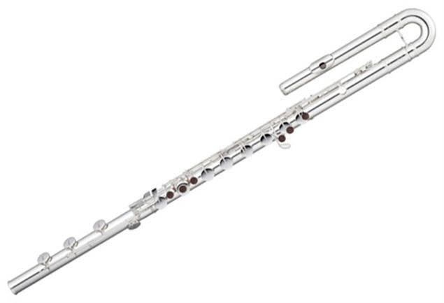 バスフルートは普通のフルートの2倍の長さ、2倍の太さからなり、1オクターブ低い音が鳴る楽器です。管体が長すぎるために、頭部管は通常U字形をしています。