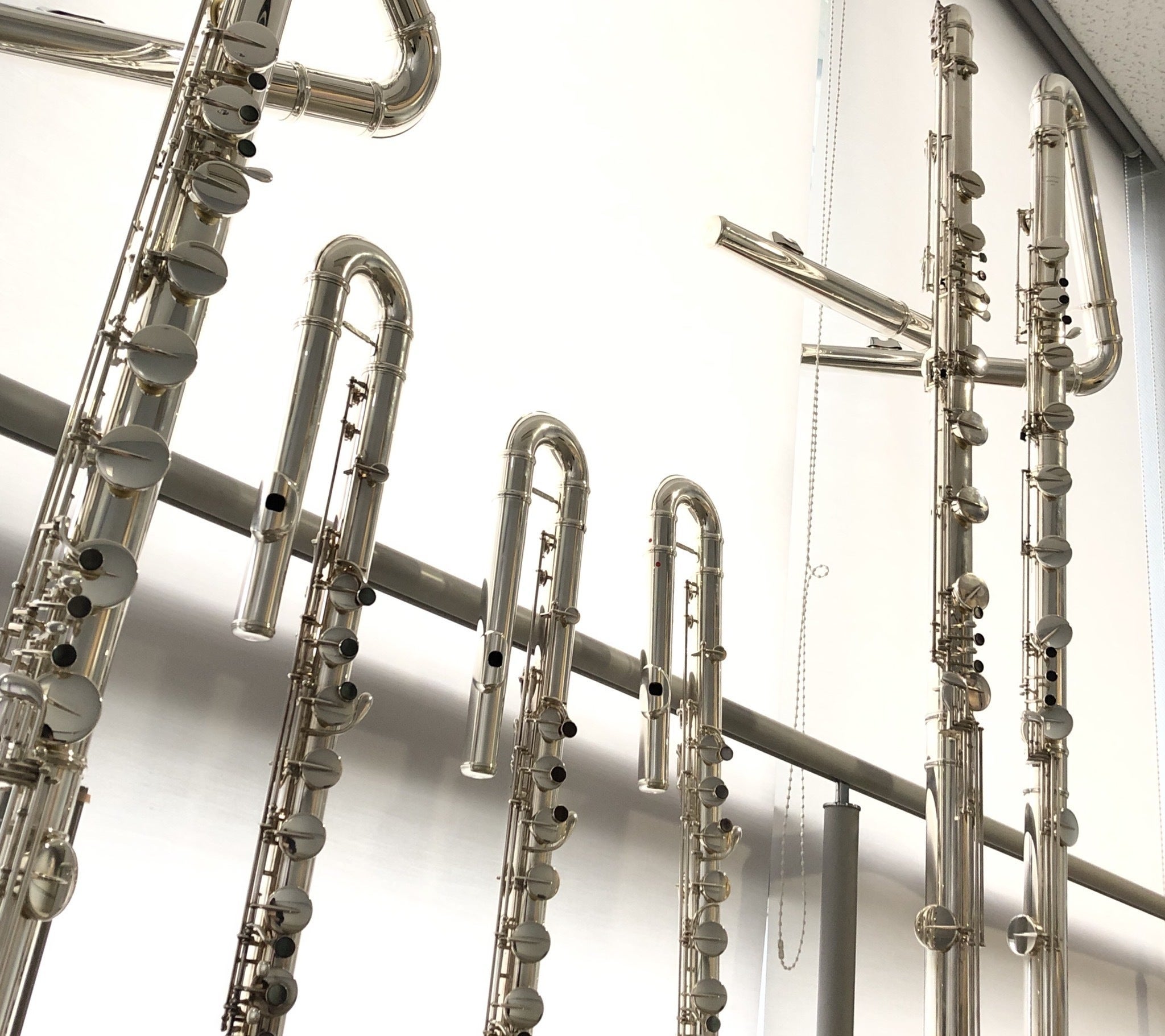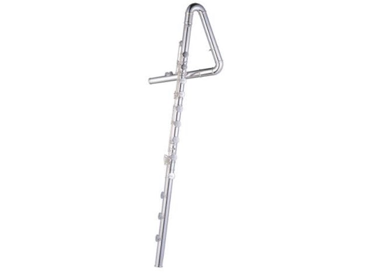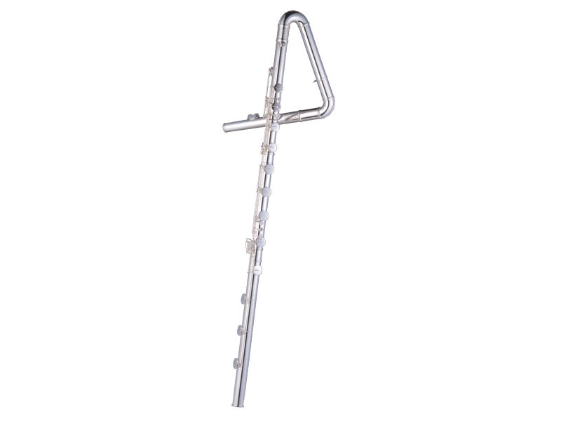 コントラバスフルートは「超低音フルート」とも位置付けられており、バスフルートのさらに1オクターブ低い音が鳴ります。その大きさと重さからフルートと同じように横に構えて吹が難しい為、立てて演奏します。そのため頭部管は4の字に曲がっており北をさしているような形をしています。