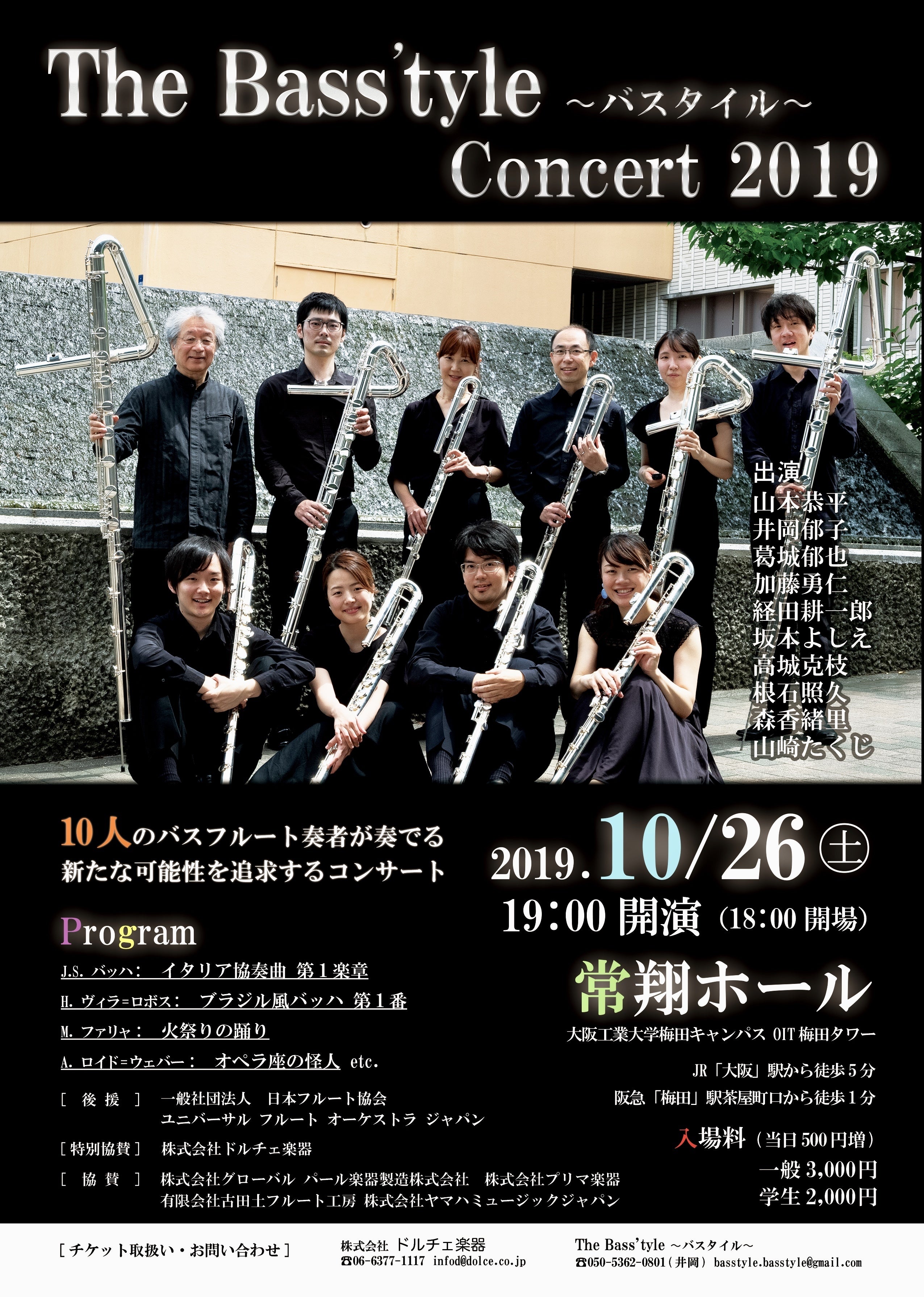 今回、このコンサートを実現するにあたり、楽器店各社様にご協力いただけることとなりました。《特別協賛》 株式会社 ドルチェ楽器《協賛》 株式会社グローバル パール楽器製造株式会社 株式会社プリマ楽器 有限会社古田土フルート工房 株式会社ヤマハミュージックジャパン《後援》 一般社団法人 日本フルート協会 ユニバーサル フルート オーケストラ ジャパン特別協賛していただくドルチェ楽器大阪店では、このコンサートの少し前に、特殊管フェアを開催して頂く予定です!!皆様に応援していただき、メンバー一同、身に余る思いでおります。コンサートの成功に向けて、ますます練習に励みます!