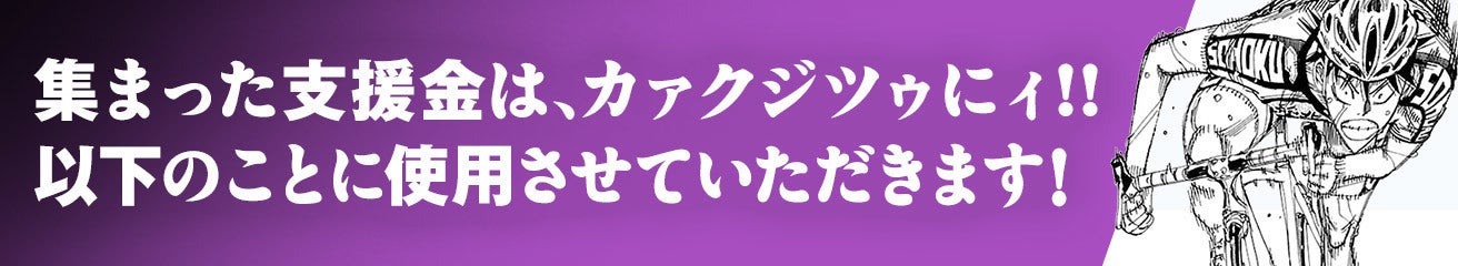 2019/06/14 20:43ご支援いただいたみなさま。本日「弱虫ペダル」のプロジェクトが終了いたします。みなさまからのあたたかいご支援をいただき、無事目標金額を達成することができました。本当にありがとうございました。みなさまからご支援頂きました金額は、イベントでの制作費用に充てさせていただきます。巨大御堂筋くんバルーンはイベント会場でお披露目。イベントを楽しみにお待ちいただければ幸いです。これからも「弱虫ペダル」ならびに「週チャン」をよろしくお願いいたします!!ドリームプロジェクト事務局 もっと見る【ついにあと3日!】終了まであと少し!最後までご支援よろしくお願いします!