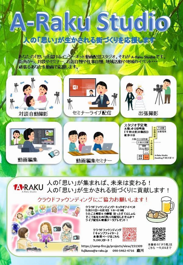 2019/06/03 02:35【人の思いが生かされる街づくり A-Raku Studio】あなたの「思い」を届けるインターネット動画配信スタジオのイメージをつかんでいただくために、2019年5月31日(金)と6月1日(土)に、12組のゲストスピーカーにご参加いただき、動画配信を体験していただきました。参加者のFacebookとA-RakuStudioのFacebookぺージに、同時配信を行いました。スタジオセットは、レンタルスタジオのため、カメラが目立たない演出などは出来ませんでしたが、スタジオ機材については、本番同等のシステム構成で運用してみました。初日は、システムの設置や配線を行い、2日めから収録・配信を行いましたが、運用への余裕がなく、配信してから、脚立がスタジオに残っていることに気がついたり、絞りの設定が明きすぎだったり余裕がありませんでしたが、3日目には、最初と最後に出演者のテロップを入れたり、肩ごしの撮影や、持ち込みチラシの書画カメラへの切り替えなど、余裕が出て来ました。今回のキックオフイベントを通して、運営のノウハウも習得することが出来ました。まあた、参加者の方にも、インターネット配信初体験の方も多く、「面白かった」「思いを伝えられた」など、ポジティブな感想をたくさんいただき、プロジェクトへの確信を得ることが出来ました。◆配信スケジュールと収録動画 (お名前を所をクリックいただくとリンクした動画が別ウィンドウで表示されます。)5月31日(金) 15:00 岡田 充代様 岡田歯科医院事務長 「お口の健康について」16:00 杉浦貴之様 マガジンと歌とRUNで伝える「命のメッセンジャー」 「がん余命告知から20年目を迎えて」17:30 薄井修司様 株式会社ウエルネスサプライ代表取締役 真おやじ塾塾長 「夫婦で震災ボランティア」 18:30 小林一尚様(カズブー)三度の飯と同じくらい音楽好きの、自称音楽バカ♪ 「トーク&ライブ」19:30 福山由佳様 モデル・女優 女子会トーク「美容のための秘訣」21:00 和泉八寿男様 高齢者向け療養食のお弁当 製造販売 元気玉の種の配達人 すこやかキッチン合同会社 6月1日(土)16:00 谷口一則様 たにぐちクリニック院長 元気と健康プロデューサー18:00 小川圭子様 助産院いのち輝かせ屋代表 国際助産師 「日本の子育て・世界の子育て」19:00 リレー・フォー・ライフ・ジャパン2019大阪あさひ実行委員会 「がんになっても困らない 社会をめざして」20:00 奈須崇様「門真国際映画祭と門真フィルムコミッション」の理事のみなさん21:00 藤田 智様 フォーク大好きおじさん 谷 昌江様 うたごえ喫茶&小劇場「ほっとすてんしょん」 ほっとするところ◆収録・配信風景 もっと見る