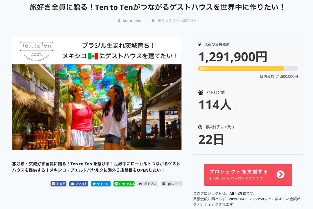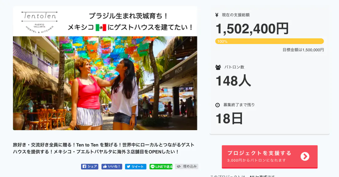 2019/06/13 22:49祝!!目標金額150万円達成!!!パトロンになってくれた皆さん!なれなくても拡散/声援などでエールを送ってくれた皆さん!!陰ながら応援してくれていた皆さん!!ありがとうございます!!目標金額150万円を達成することができました!これも皆さんのおかげです!!皆さんのご協力/応援で、思ったよりもすごいスピードで目標金額を達成することができました!!大大大感謝です!皆さんの応援により、何としてもTen to Ten Puerto Vallartaをオープンせねば!Ten to Tenが札幌で作っている出会いを、空間を、旅の思い出をメキシコでも生み出せるように頑張ります!そして!!150万円を達成したので、ストレッチゴールを設定します!明日中に再度ストレッチゴール(そしてその目的)を際発表しますのでぜひチェックしてください!再度!皆さんの応援に感謝です!ストレッチゴールの再投稿をお待ちください〜!それではまた!Hasta Luego! アスタルエゴ! (See you later!) もっと見る