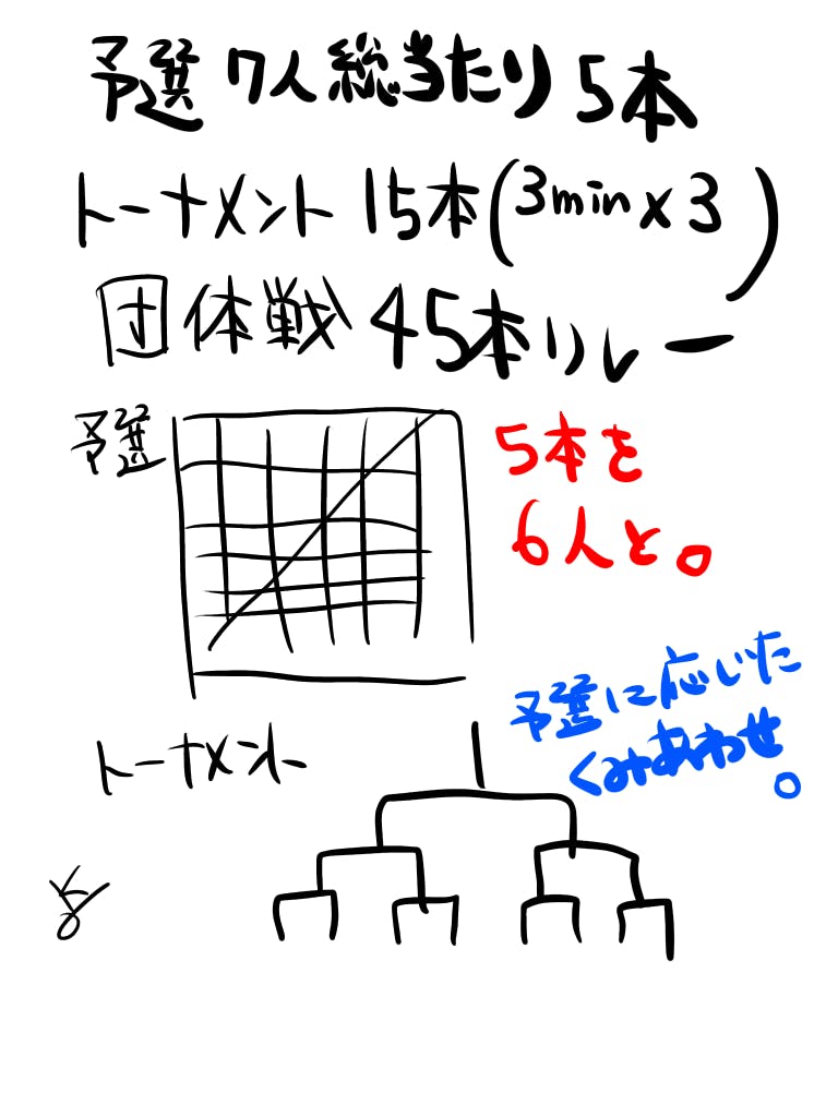 予選は5本勝負。トーナメントは基本的には、15本勝負です。