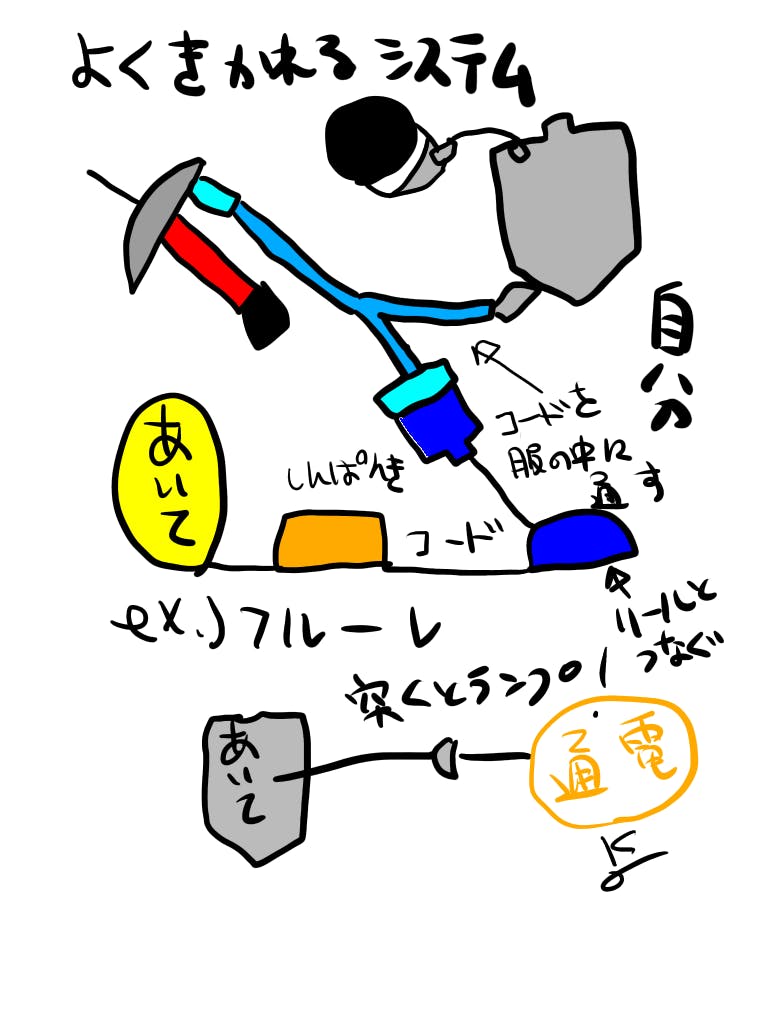 ワイヤーと呼ばれるコードで、剣と金属が埋め込まれた電気を通すメタルジャケットと、