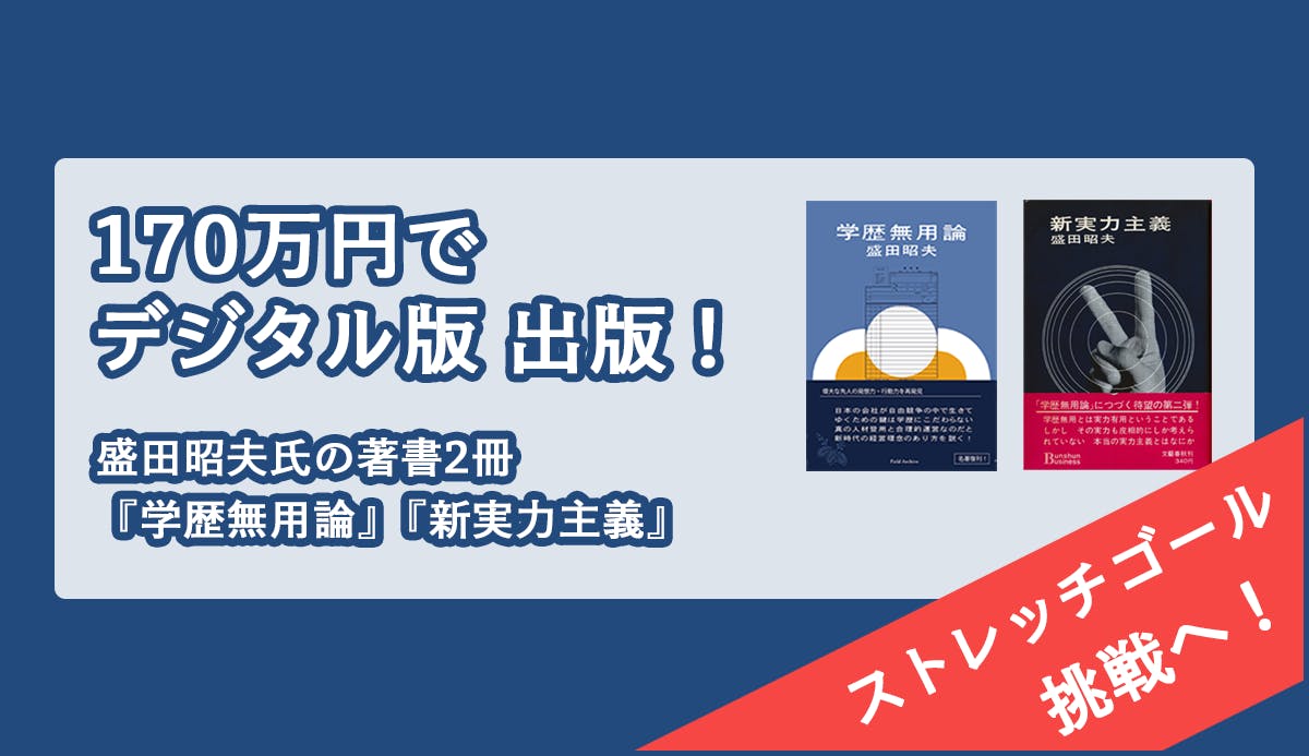 いままでデジタル版として出されていなかった盛田昭夫氏の初著書『学歴無用論』も含め、今回オフセット版で復刊することが決定した『新実力主義』とあわせて、盛田昭夫氏の著作2冊を、デジタル版にて出版に挑戦したいと思います。