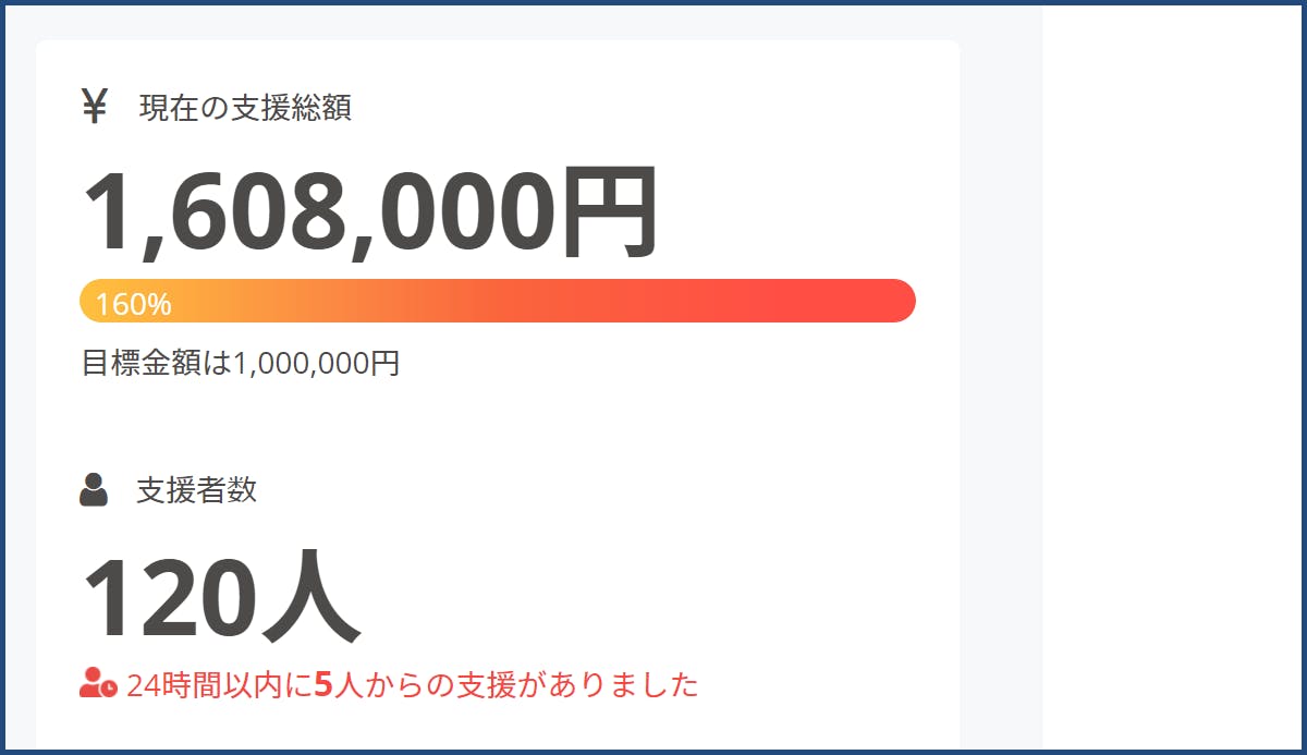 50日間の挑戦、120名の方にご支援いただき総額¥1,608,000となりました。