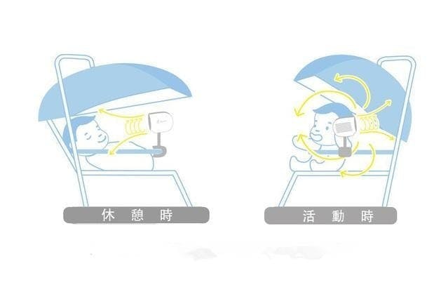 右下図のように、ベビーカーのシートに空気を吹き付けることで、空気の流れが跳ね返り清浄された領域を作り出すことができます。鼻や口に直接空気を送り込む時ほどではありませんが、一定の効果があります。