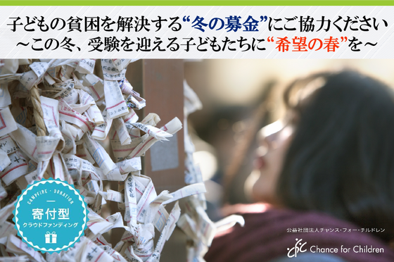 2017/01/13 17:5812月1日から実施していた「子どもの貧困を解決する冬の教育募金」プロジェクト期間が終了しましたので、ご支援いただいた皆さまにご報告をさせていただきます。 CFCは、経済的な困難を抱えている家庭の子どもたちに、学習塾や習い事で利用できる「教育クーポン」を提供しており、今回の冬の教育募金プロジェクトは、特に冬に受験を控える中学3年生、高校3年生を応援するために開始しました。 そしてこの度、個人・団体の皆さまから、目標としていた250万円を上回る、総額3,167,996円ものご寄付をいただきました。温かいご支援をいただいた皆さま、お知り合いに当法人の活動を紹介してくださった皆さまには、心から感謝申し上げます。ご寄付は大切に、子どもたちの学習の機会に活用させていただきます。 また今回ご寄付をいただいた方には、子どもたちへ「ためらいなく、希望通りの進路を選択できますように。」「たまには息抜きもしてくださいね。」といった、たくさんの応援の言葉をいただきました。早くも1月半ばとなり、これから子どもたちも受験本番を迎えます。ひとりでも多くの子どもたちが希望の進路を叶えられるよう、スタッフ一同、今後とも全力でサポートしてまいります。 ◆冬の教育募金 実施報告・実施期間: 2016年12月1日(木)〜2017年1月10日(火)・寄付総額: 3,167,996円 もっと見る