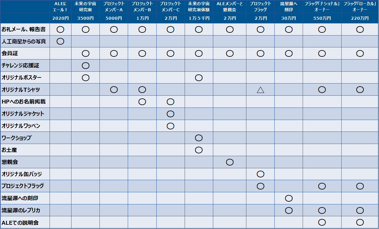 「ALEのチャレンジ、面白い!」と感じてくださり、気軽に支援したいと言ってくださっている方のためのプランです。2020年の世界で初めてとなる人工流れ星の実現!にちなんだ設定です。