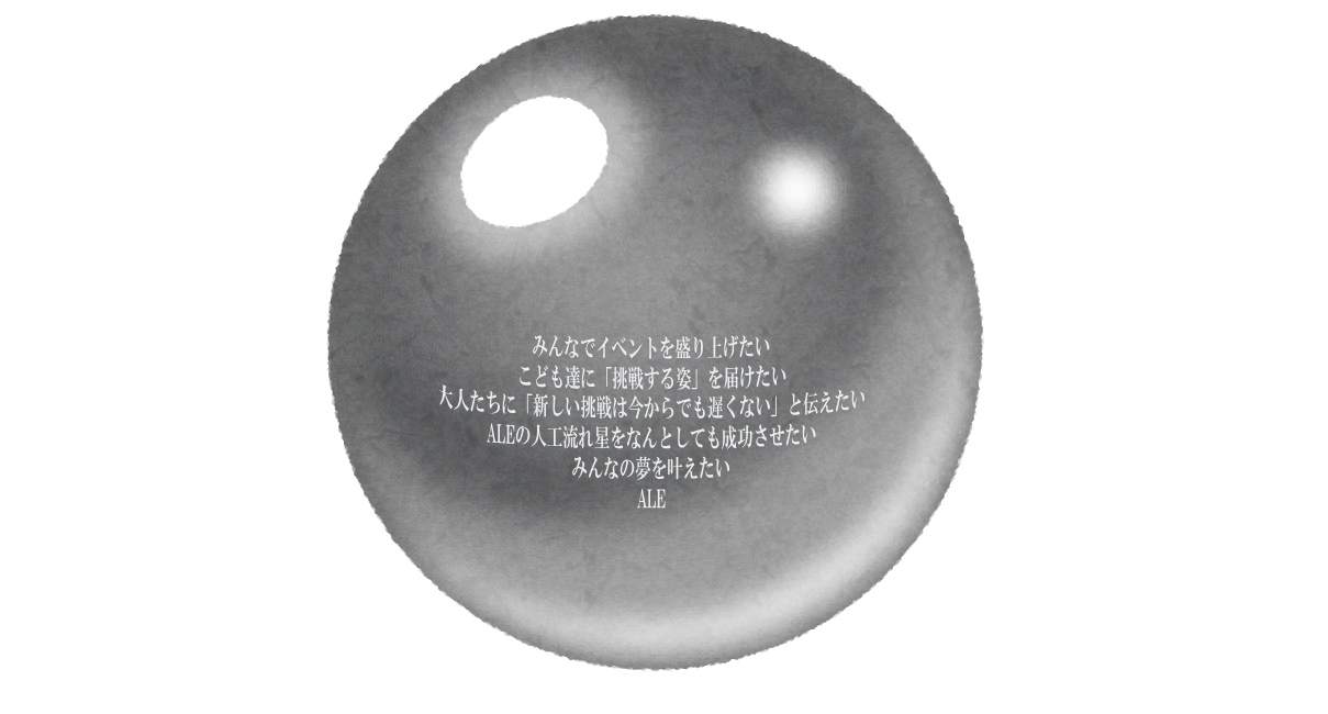 株式会社ALEは、人工流れ星による夜空を舞台にした「宇宙エンターテインメント」に取り組んでいます。私たちは、子どもから大人まで、宇宙への興味や好奇心をかき立てられるような体験を作り上げていきたいと考えています。
