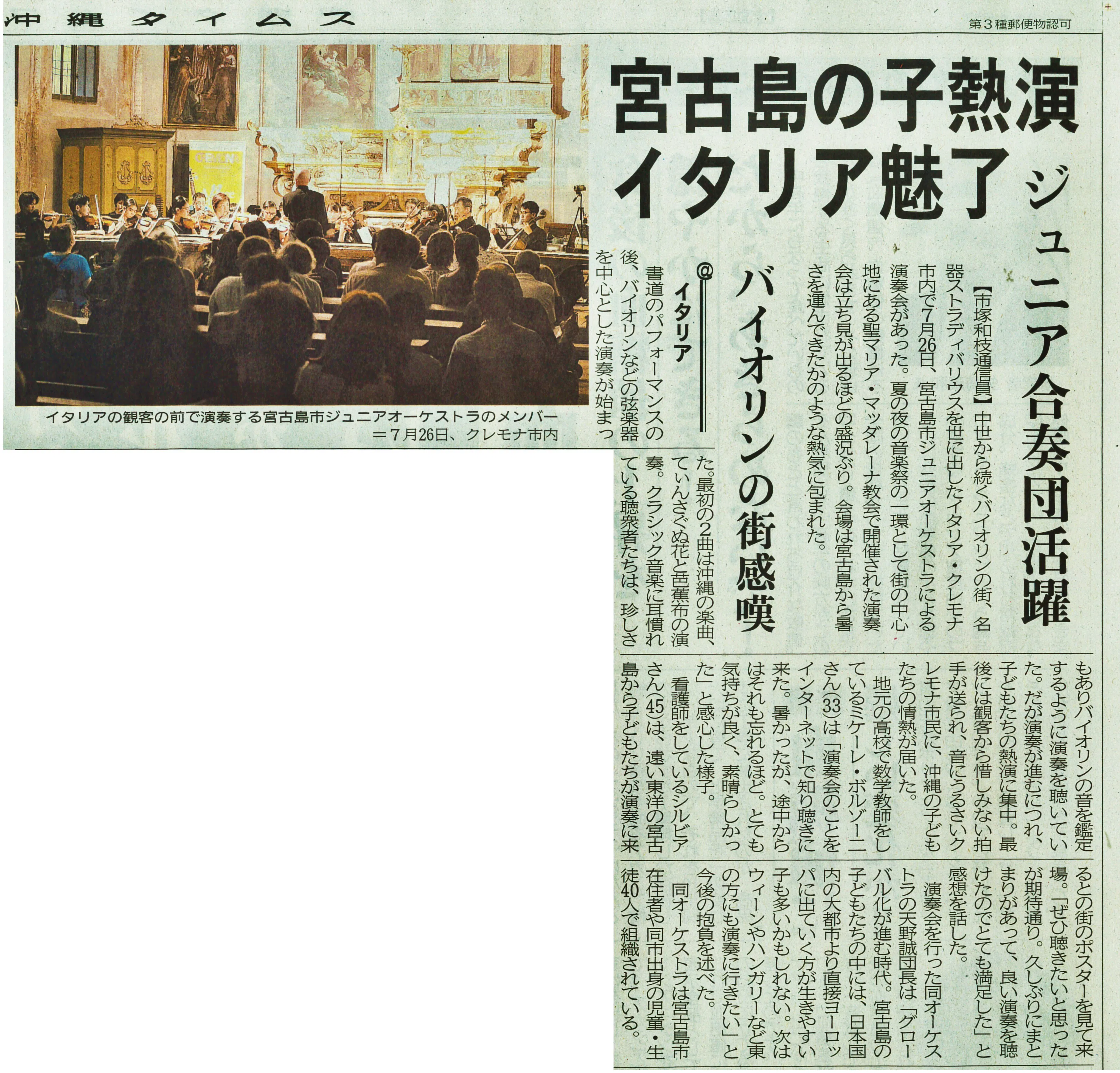 宮古島市ジュニアオーケストラのクレモナ公演を、沖縄タイムスのミラノ通信員さんが聴きに来てくれていました。