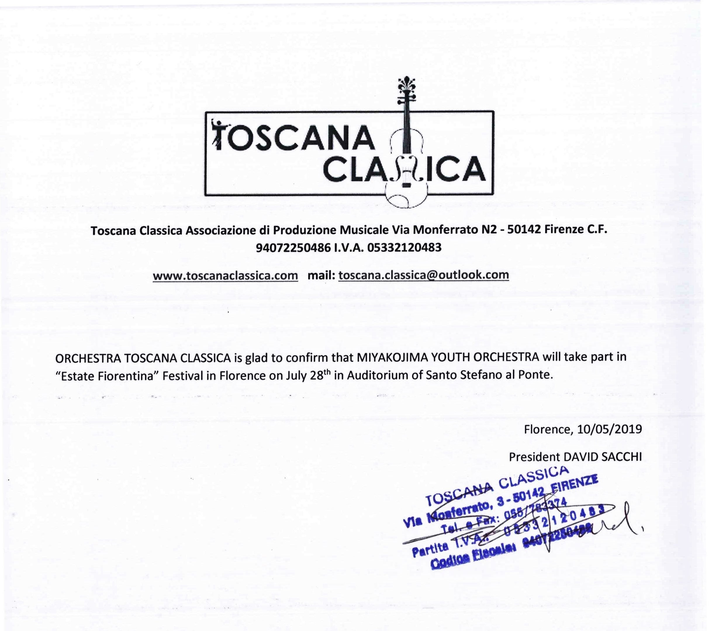Orchestra Toscana Classica という、フィレンツェの音楽祭を運営するオーケストラから、「宮古島市ジュニアオーケストラがフィレンツェの夏の音楽祭に参加することを歓迎する」という書類をいただきました。 皆様ご協力ありがとうございます。We received a document from the orchestra that manages the music festival in Florence called Orchestra Toscana Classica, "We are glad to confirm the Miyakojima Junior Orchestra to participate in the summer music festival in Florence".... Thank you for your cooperation!