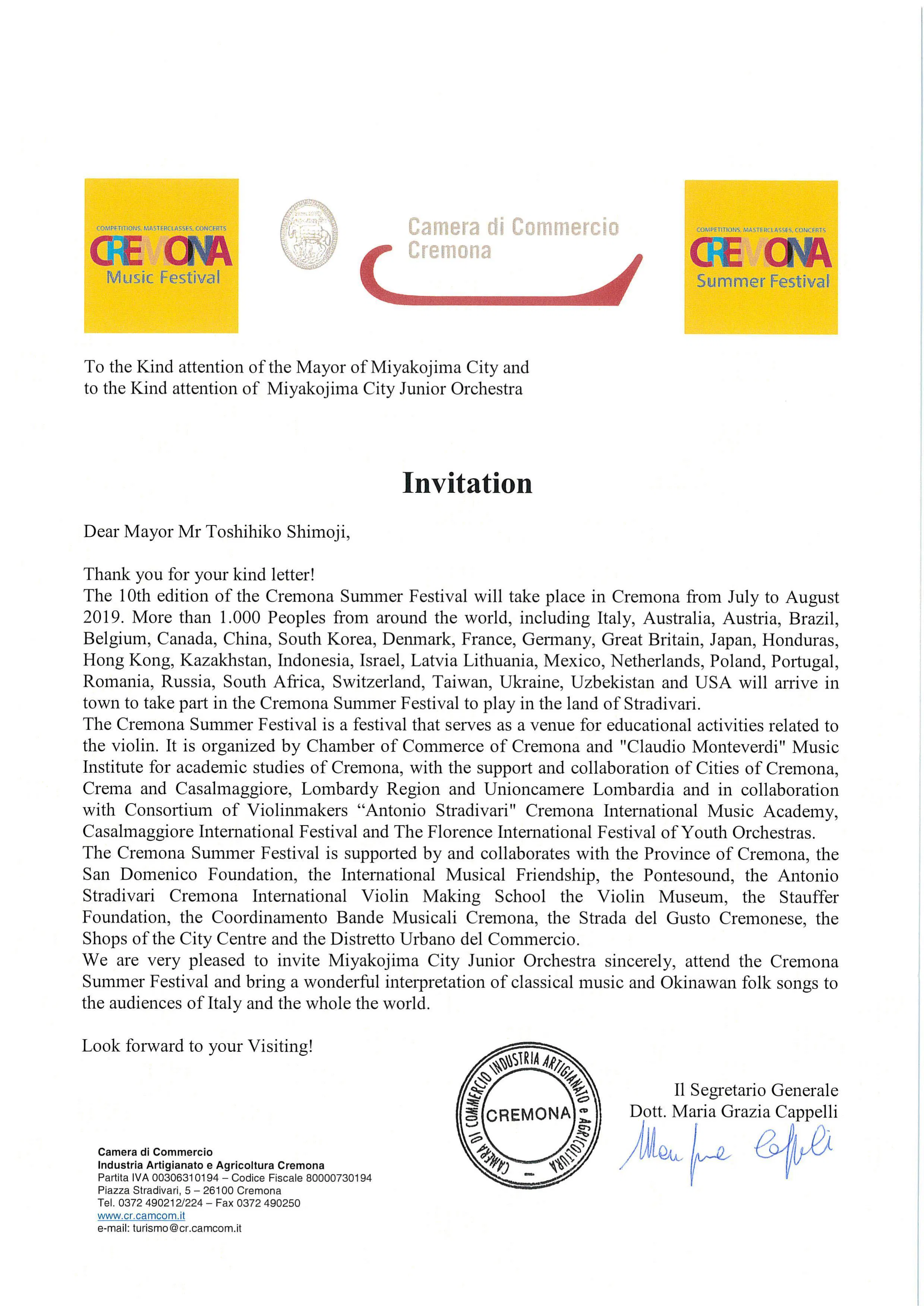 クレモナの夏の音楽祭を主催する、クレモナ商工会議所から、Invitation letter をいただきました。