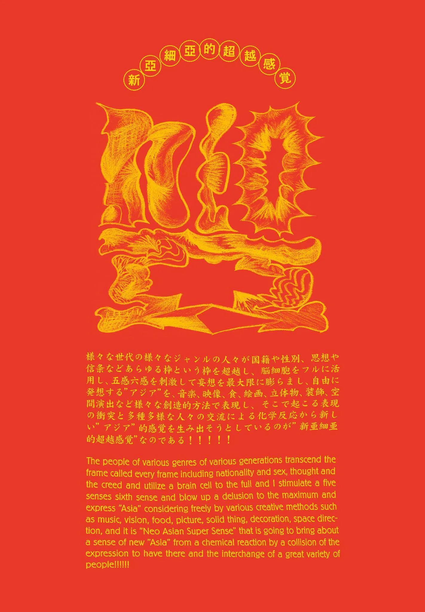 この「新亜細亜的超越感覚(しんあじあてきちょうえつかんかく)」というイベントでは、様々な世代の様々なジャンルの人々が国籍や性別、思想や信条などを超えて、自分の内にある“アジア“感を、「音楽」「映像」「食」「絵画」「立体物」「装飾」「空間演出」「ダンス」などの様々な創造的方法で自由に表現し、そこで起こる表現の衝突と多種多様な人々の交流による化学反応から更なる新しい“アジア”的感覚を生み出そうとしています。(新亜細亜的超越感覚実行委員会 代表 池田義文)