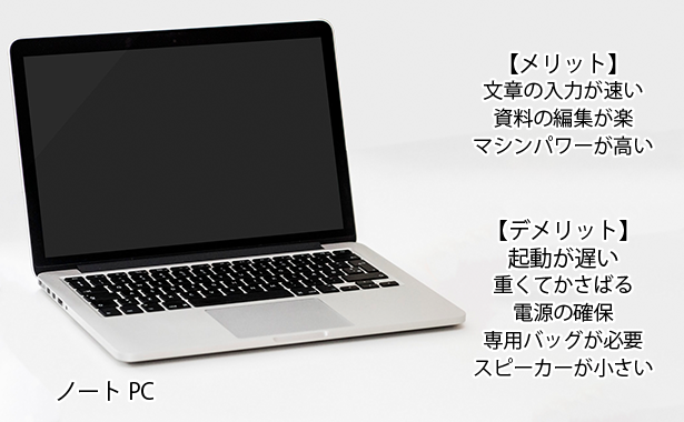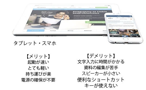 起動が速く携帯性が高い反面、メール程度の文章では問題ありませんが、ボリュームのある文書や資料の作成は苦手です。